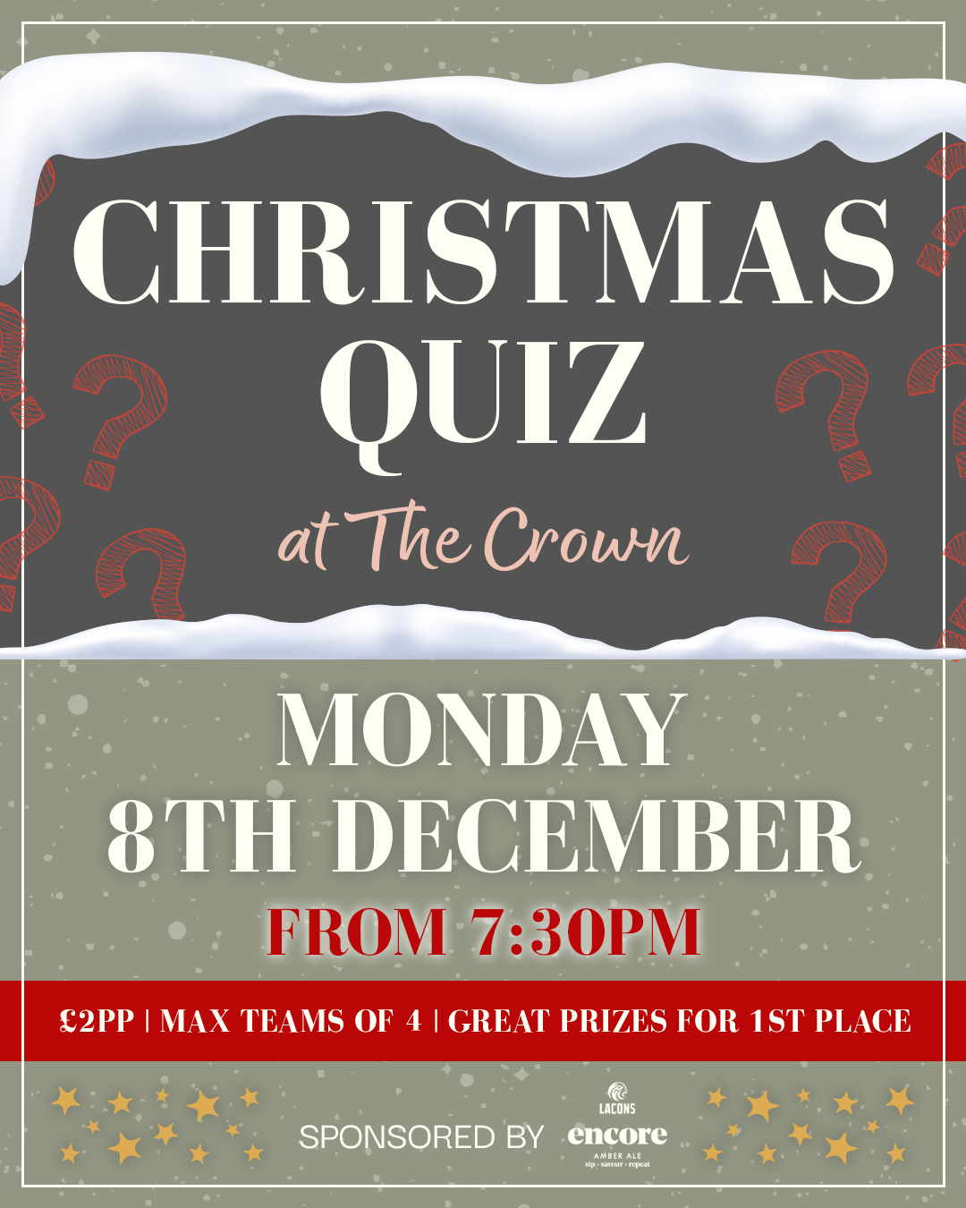 Join us at The Crown for a special Christmas Quiz Night filled with festive fun, friendly competition, and plenty of cheer. Gather your team, brush up on your Christmas classics, and get ready for a cosy evening of laughs, questions, and a few surprises along the way.