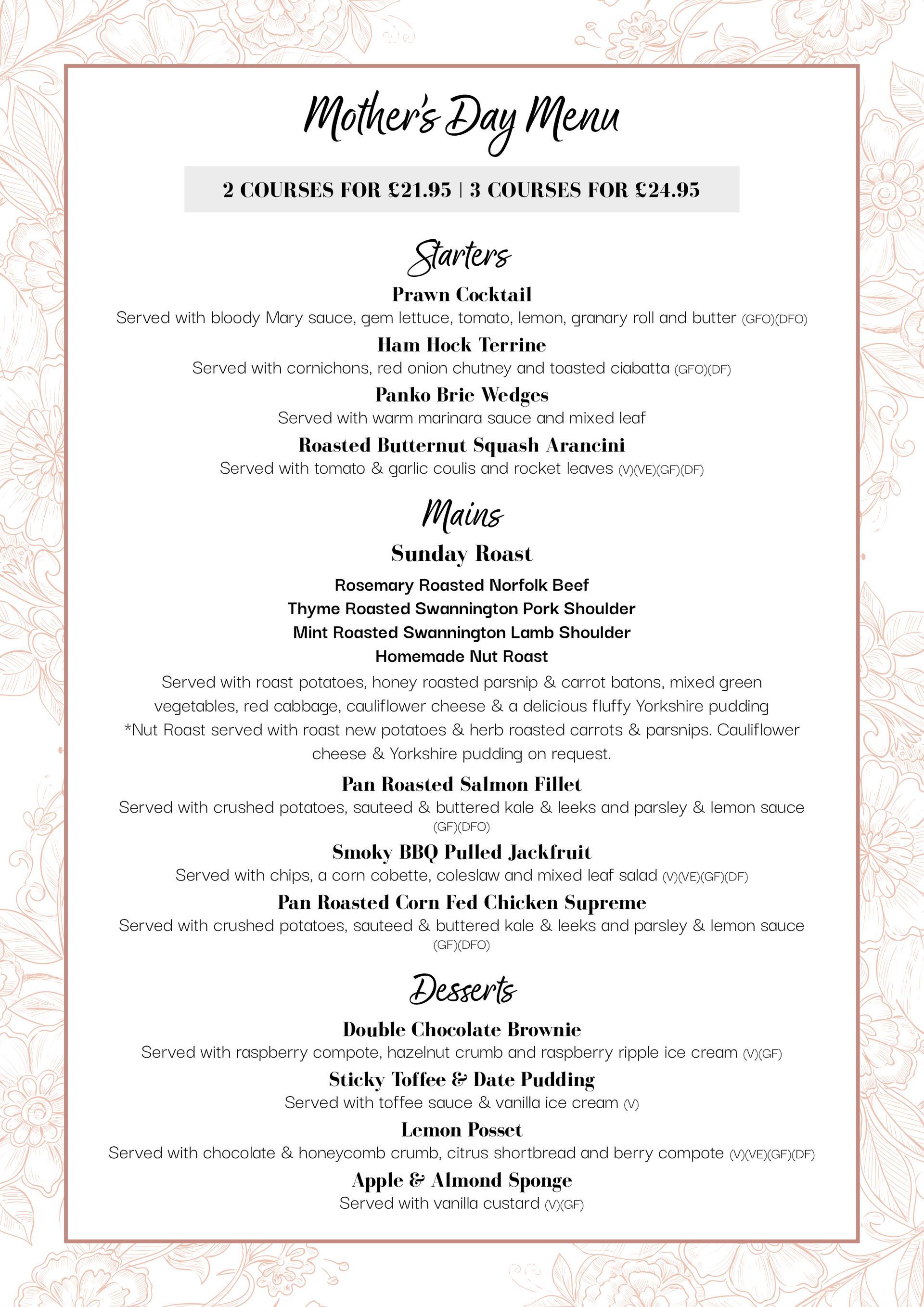 We're offering a special set menu on Mother's Day (Sunday 15th March), with 2 courses for £21.95, and 3 for £24.95. Find the menu below.